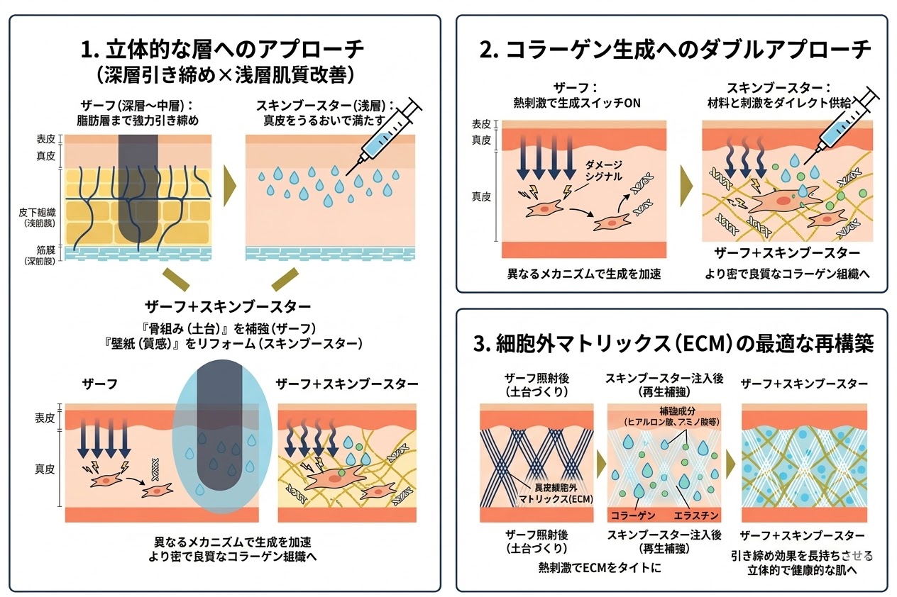RF monopolar multi-frekuensi Zurf menghantarkan panas pada area yang luas dari dermis ke lapisan lemak, dengan kuat mengencangkan 'kelonggaran lapisan dalam' yang menyebabkan kekenduran. Skin Booster, di sisi lain, secara langsung mendekati epidermis dari tepat di bawah epidermis ke lapisan dermis untuk meningkatkan kelembapan, kekencangan, serta garis-garis halus dan kerutan. Analogi bangunan,Memperkuat kerangka kerja (membangun fondasi)" dengan Zarf dan "merenovasi wallpaper (meningkatkan tekstur)" pada saat yang sama dengan Skinbooster.Ini adalah gambar seperti.
