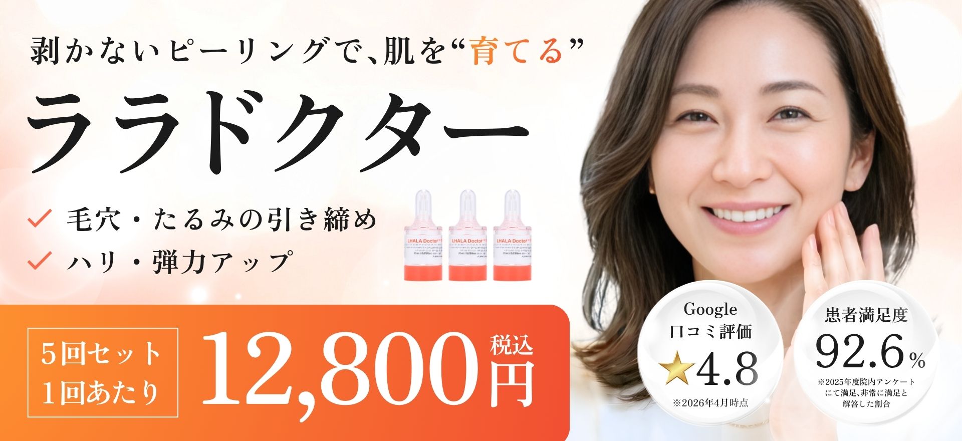 - ララドクターの効果:ララピールの効果に加え、真皮層のコラーゲン・エラスチン増生による「ハリ感」「弾力」「小じわ改善」「引き締め」効果が期待できる