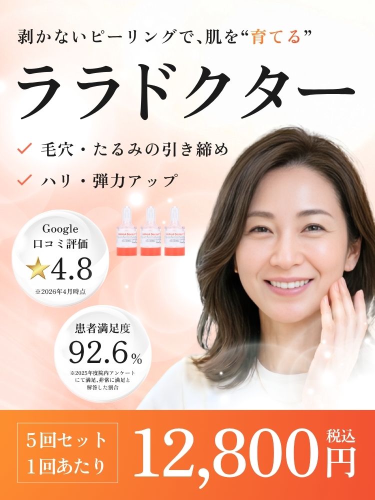 ララドクターは、ただ角質を除くだけでなく、肌の土台から「満たして育てる」治療です。「痛みやダウンタイムは避けたい、でもしっかり効果を出したい」という人におすすめです。